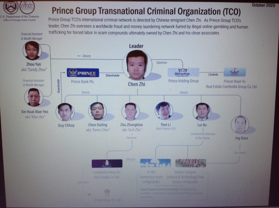 L'OFAC a imposé des sanctions draconiennes à 146 cibles au sein de l' organisation criminelle transnationale Prince Group (Prince Group TCO), un réseau basé au Cambodge dirigé par le Cambodgien Chen Zhi, qui gère un empire criminel transnational par le biais d'escroqueries à l'investissement en ligne ciblant des Américains et d'autres personnes dans le monde entier. Par ailleurs, le FinCEN a finalisé une règle en vertu de l'article 311 de l'USA PATRIOT Act visant à dissocier le conglomérat de services financiers cambodgien Huione Group du système financier américain. Depuis des années, Huione Group blanchit les profits d'escroqueries et de vols de monnaies virtuelles pour le compte de cyberacteurs malveillants.