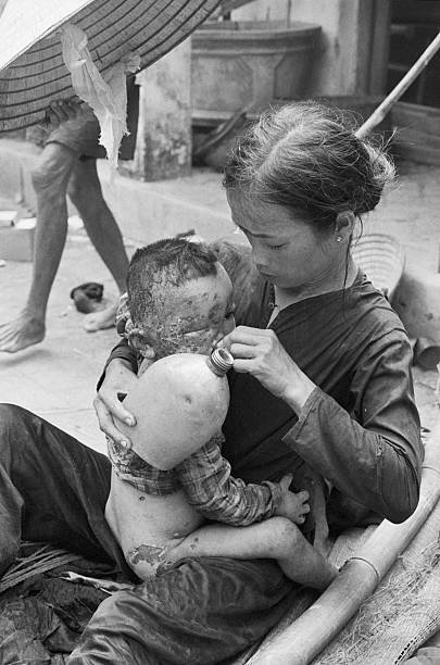 Phan Thị Kim Phúc. Née le 2 avril 1963 à Trang Bang. Nord-ouest de Saigon. Province de Tay Ninh. 8 juin 1972. Un avion sud-vietnamien largue des bombes au napalm sur Trang Bang. Le photographe Huyng Cong Nick Ut de l’agence Associated Press photographie l’enfant très gravement brûlée, courant sur le chemin. Il obtient le World Press Photo en 1972 et le Prix Pulitzer de la photo d’actualité en 1974. La photo devient l’emblème de l’atrocité du napalm. Même si ce serait Nguyen Thanh Nghé, l’auteur de la photo, qui travaille ce jour-là comme chauffeur pour l’équipe américaine de NBC. Ce qui déclenche une tempête juridique actuellement.