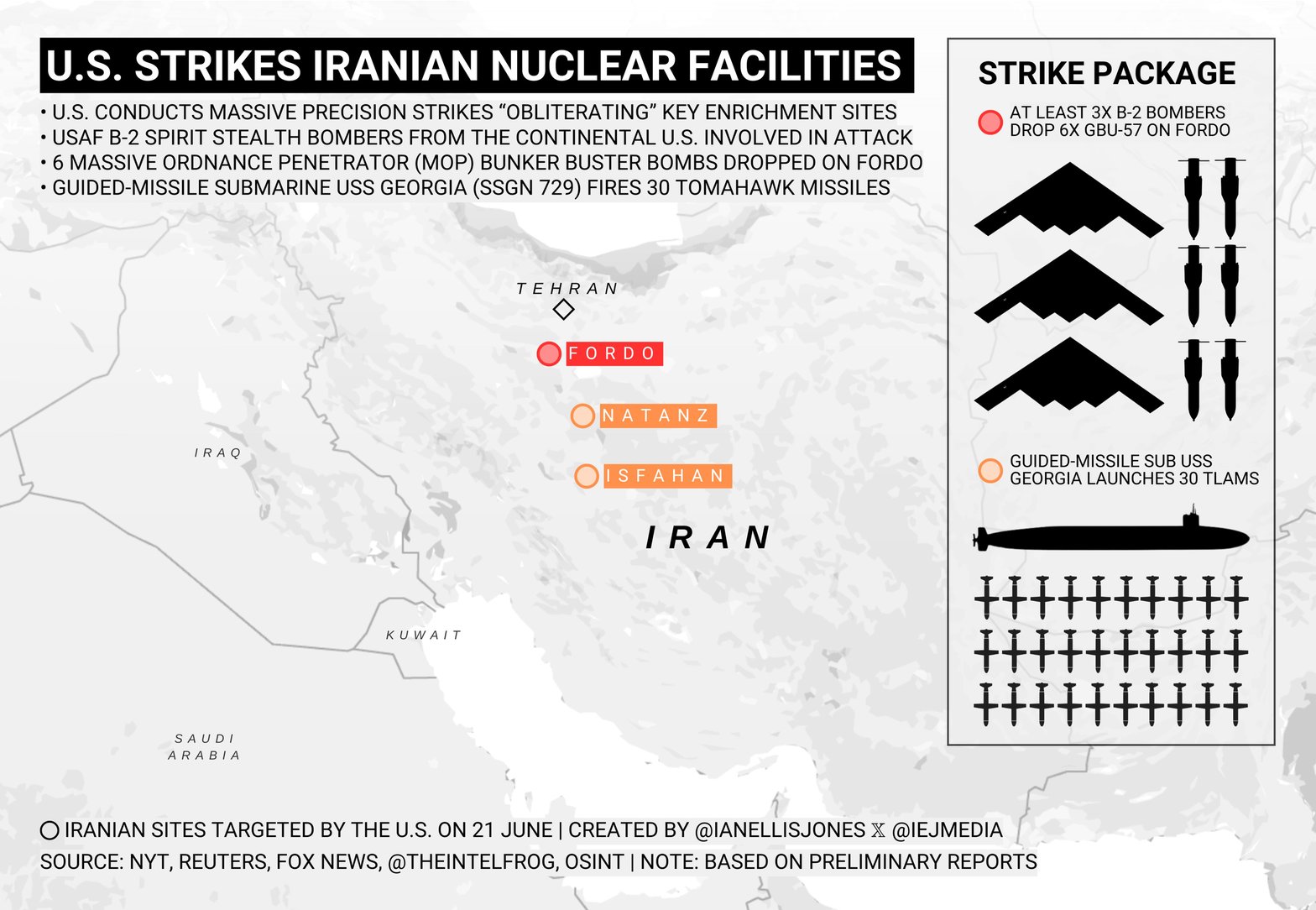 The strike package was supported by U.S. Strategic Command, U.S. Transportation Command, U.S. Cyber Command, U.S. Space Command, U.S. Space Force and U.S. European command. As the strike package approached Fordow and Natanz, the U.S. protection package employed high speed suppression weapons to ensure safe passage of the strike package with fighter assets employing preemptive suppressing fires against any potential Iranian surface to air threats.