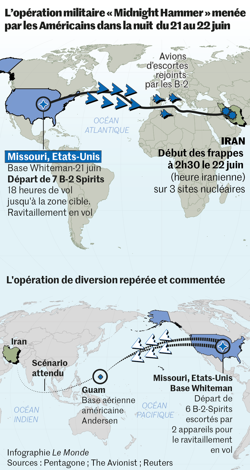 Nouveaux détails du général Dan Caine, chef d'état-major interarmées, sur l'opération « Midnight Hammer » • Vendredi, un important dispositif d'attaque B-2 a été lancé depuis le continent américain. Pour maintenir la surprise tactique, une partie du dispositif s'est dirigée vers l'ouest, dans le Pacifique, comme leurre/effort de tromperie. • Le principal dispositif d'attaque, composé de sept bombardiers B-2 Spirit, a volé vers l'est sans être détecté. Plus de 125 avions américains y ont participé, utilisant plus de 75 munitions guidées avec précision. • Vers 17 heures HE, juste avant que le groupe de frappe n'entre en Iran, un sous-marin américain du CENTCOM a lancé plus de deux douzaines de missiles de croisière d'attaque terrestre Tomahawk contre des cibles d'infrastructures de surface clés. • Vers 18h40 HE, le B-2 de tête a largué deux bombes à pénétration massive (MOP) GBU-57 sur le premier de plusieurs points visés à Fordo. Les bombardiers restants ont ensuite atteint leurs cibles, avec 14 MOP largués sur deux zones nucléaires. • Les trois cibles de l'infrastructure nucléaire iranienne ont été frappées entre 18h40 et 19h05, heure de l'Est, les missiles Tomahawk étant les derniers à avoir été touchés. • Alors que le groupe de frappe entrait dans l'espace aérien iranien, les États-Unis ont employé plusieurs tactiques de tromperie, notamment des leurres tandis que les avions de 4e et 5e générations avançaient en avant, recherchant les chasseurs ennemis et les menaces de missiles sol-air. • Les dommages finaux de la bataille prendront un certain temps, mais les premières évaluations des dommages de la bataille indiquent que les trois sites ont subi des dommages et des destructions extrêmement graves. • À ce jour, aucun coup de feu n'a été tiré sur le convoi à l'aller comme au retour. Les chasseurs iraniens n'ont pas volé et il semble que les systèmes de missiles sol-air iraniens n'aient pas été utilisés tout au long de la mission. Après le largage des armes, le convoi a quitté l'espace aérien iranien et a entamé son retour. • Le plan de frappe a été soutenu par le Commandement stratégique américain, le Commandement des transports américain, le Commandement cybernétique américain, le Commandement spatial américain, la Force spatiale américaine et le Commandement européen américain.
