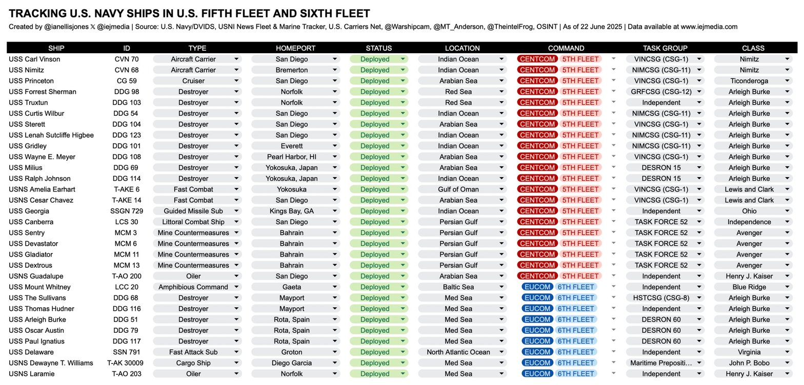 30+ U.S. Navy ships are deployed in the CENTCOM and EUCOM AOR, including 2x carrier strike groups, 13-14x destroyers, 4x mine countermeasure ships, at least 4x submarines, and 6th Fleet flagship, amphibious command ship USS Mount Whitney (LCC 20).