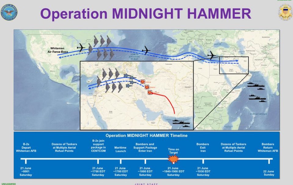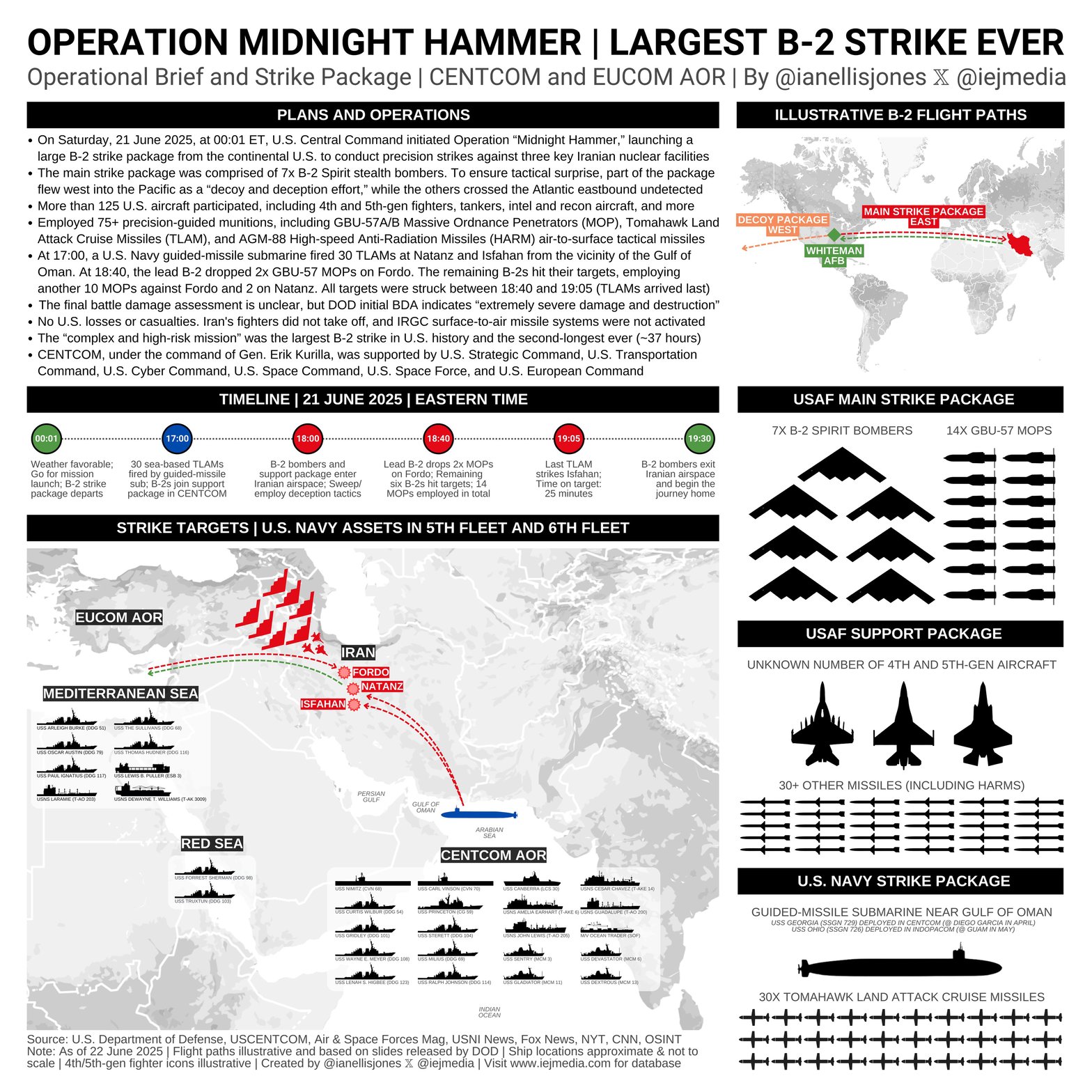 New details from Gen. Dan Caine, Chairman of the Joint Chiefs of Staff, on Operation "Midnight Hammer" • On Friday, a large B-2 strike package launched from the continental U.S. To maintain tactical surprise, part of the package proceeded west into the Pacific as a decoy/deception effort. • The main strike package, comprised of 7x B-2 Spirit bombers, flew east undetected. More than 125 total U.S. aircraft participated, employing 75+ precision-guided munitions. • At ~5pm ET, just prior to the strike package entering Iran, a U.S. submarine in CENTCOM launched more than two dozen Tomahawk land attack cruise missiles against key surface infrastructure targets. • At ~6:40 PM ET, the lead B-2 dropped two GBU-57 Massive Ordnance Penetrator (MOP) weapons on the first of several aim points at Fordo. The remaining bombers then hit their targets, with 14 MOPs dropped against 2 nuclear target areas. • All three Iranian nuclear infrastructure targets were struck between 6:40 PM and 7:05 PM Eastern time, with the tomahawk missiles last. • As the strike package entered Iranian airspace, the U.S. employed several deception tactics, including decoys as 4th and 5th-gen aircraft pushed out in front, sweeping for enemy fighters and surface-to-air missile threats. • Final battle damage will take some time, but initial battle damage assessments indicate that all three sites sustained extremely severe damage and destruction. • Currently unaware of any shots fired at the strike package on the way in or out. Iran's fighters did not fly, and it appears that Iran's surface-to-air missile systems did not see use throughout the mission. Following weapons release, the package exited Iranian airspace and began its return home. • The strike package was supported by U.S. Strategic Command, U.S. Transportation Command, U.S. Cyber Command, U.S. Space Command, U.S. Space Force, and U.S. European Command.