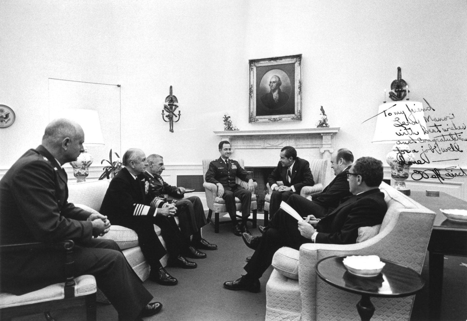 Briefing Dr Henry Kissinger. Thursday October 8th , 1970. Bull Simons, BGen Manor, and BGen Blackburn were in the White House today briefing Dr Henry Kissinger (National Security Advisor).