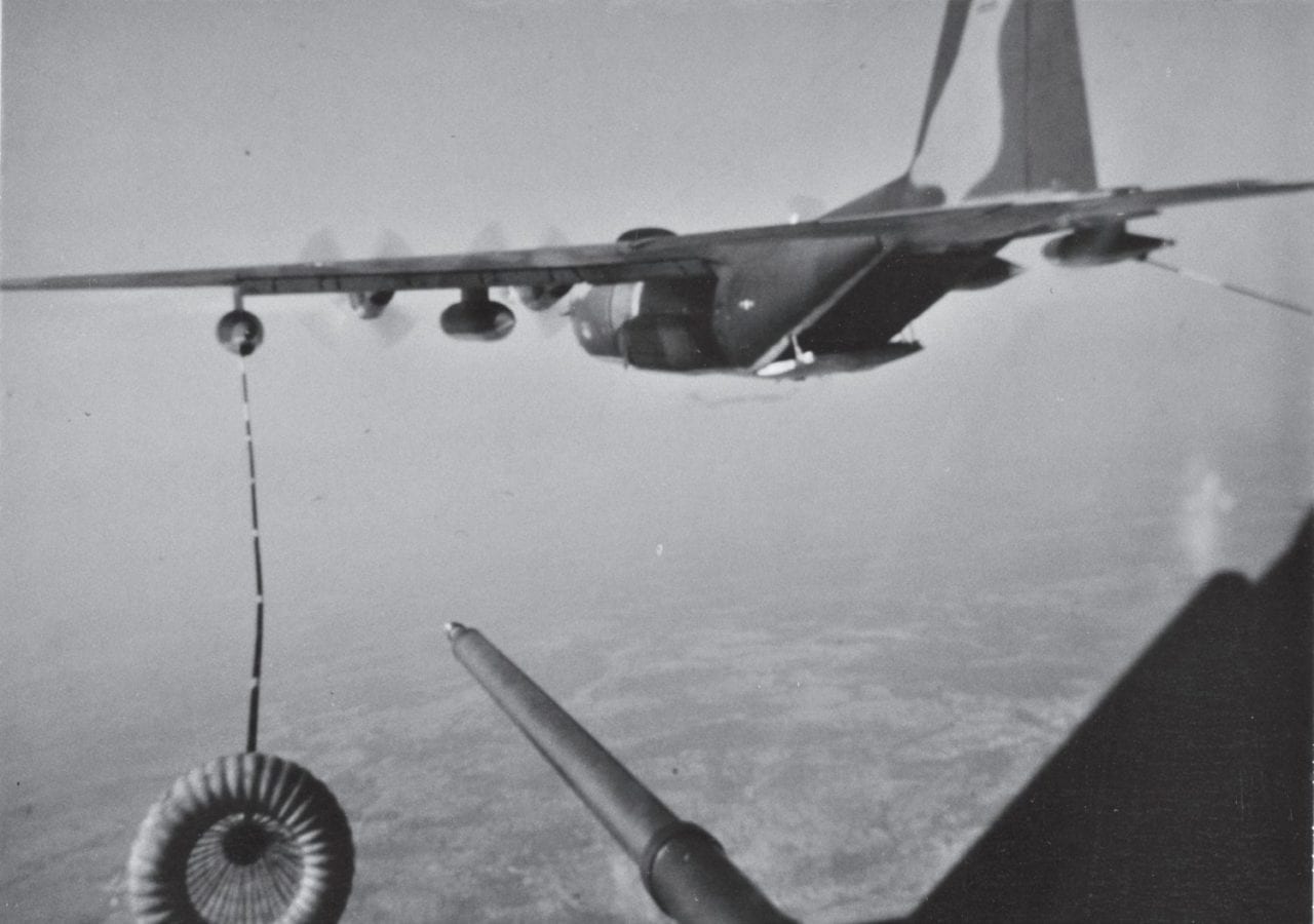 In daylight, a CH-53C approaches an HC-130P tanker to refuel. In the Son Tay raid, this challenging maneuver was done at night and at low altitude, in radio silence and without lights. Photo credit: USAF/NATIONAL ARCHIVES. Caption: Defensemedianetwork.com